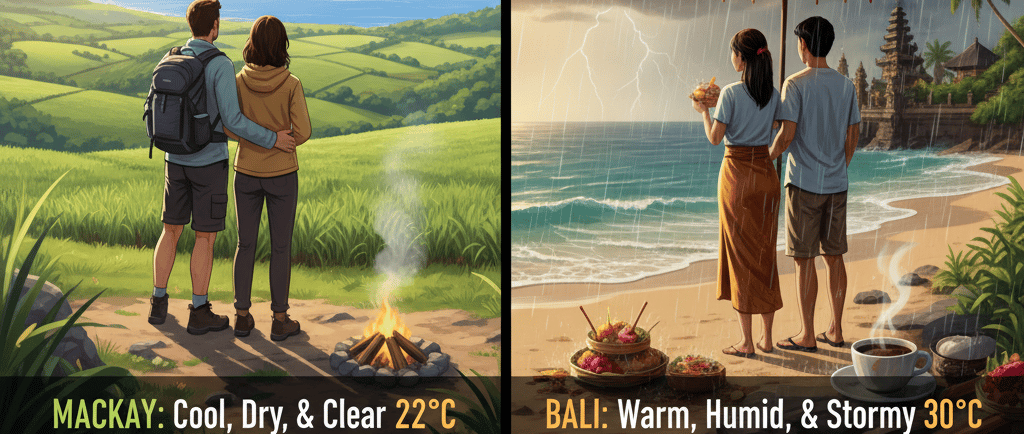 MonthMackay: Average High (°C)Mackay: Primary SeasonBali: Average High (°C)Bali: Primary SeasonJan30Wet, Hot, High Humidity31Wet, HumidJul22Dry, Mild, Low Humidity28Dry, Peak SeasonSep25Dry, Warming Up29Dry, Shoulder SeasonDec30Wet, Hot, Cyclone Season Begins30Wet, Humid (Holiday Peak)